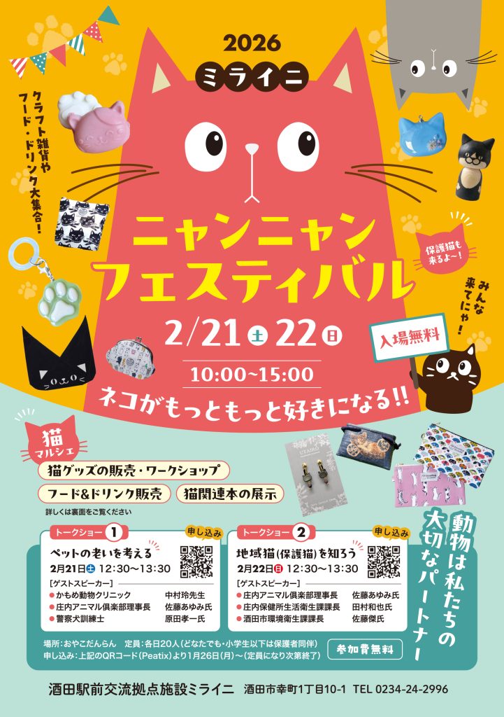 令和8年2月21日(土)、22日(日)の2日間、酒田駅前ミライニで、「2026ミライニ ニャンニャンフェスティバル」が開催されます。